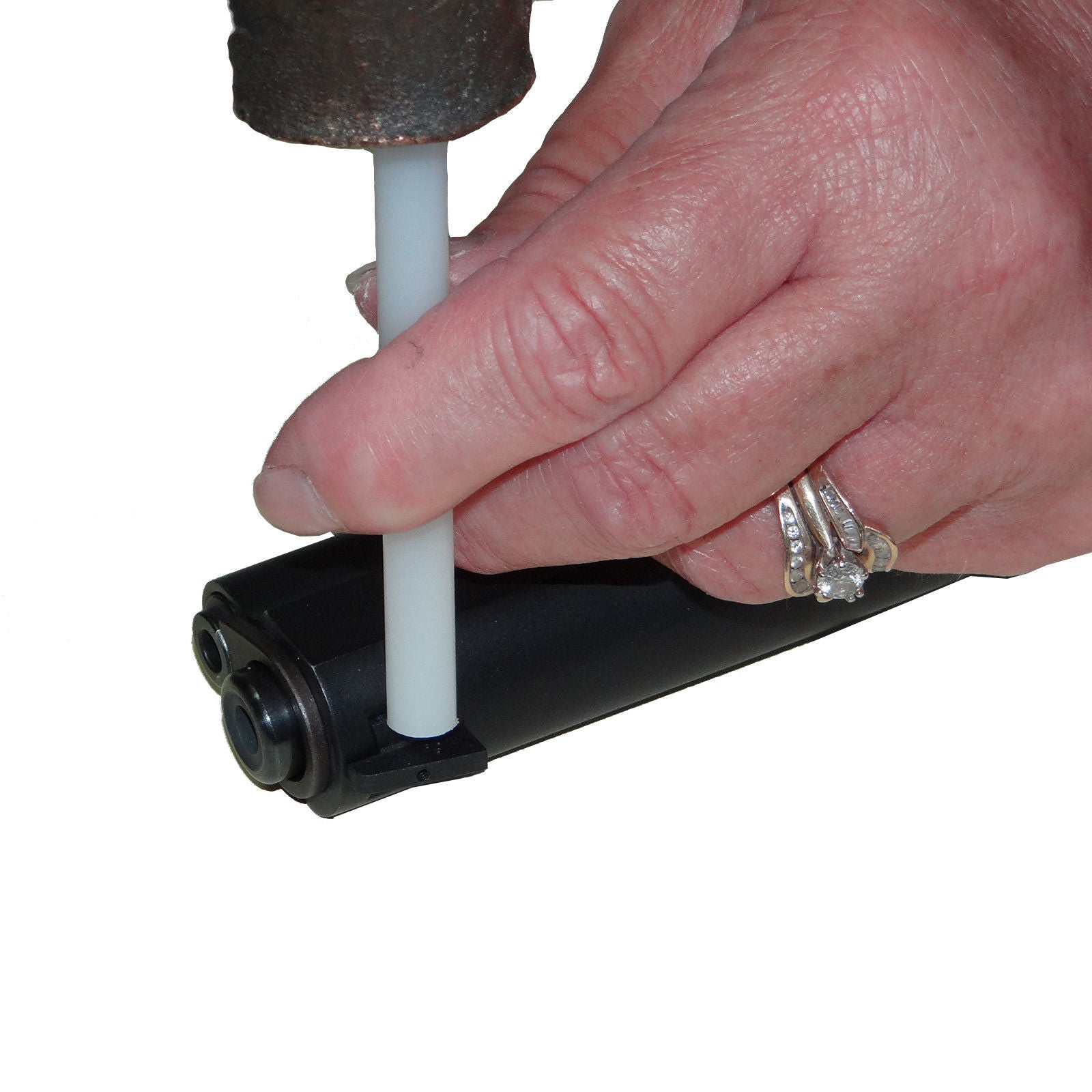Simple and effective front sight removal tool that will work with Glock and 1911 that have a dovetail style front sight. This drift punch is made from a special polymer that will not shatter when struck with a hammer yet it has enough strength to move a dovetail front sight. Our drift punch is a better choice than brass for front sight removal because it will not leave a “brass track” on the slide.