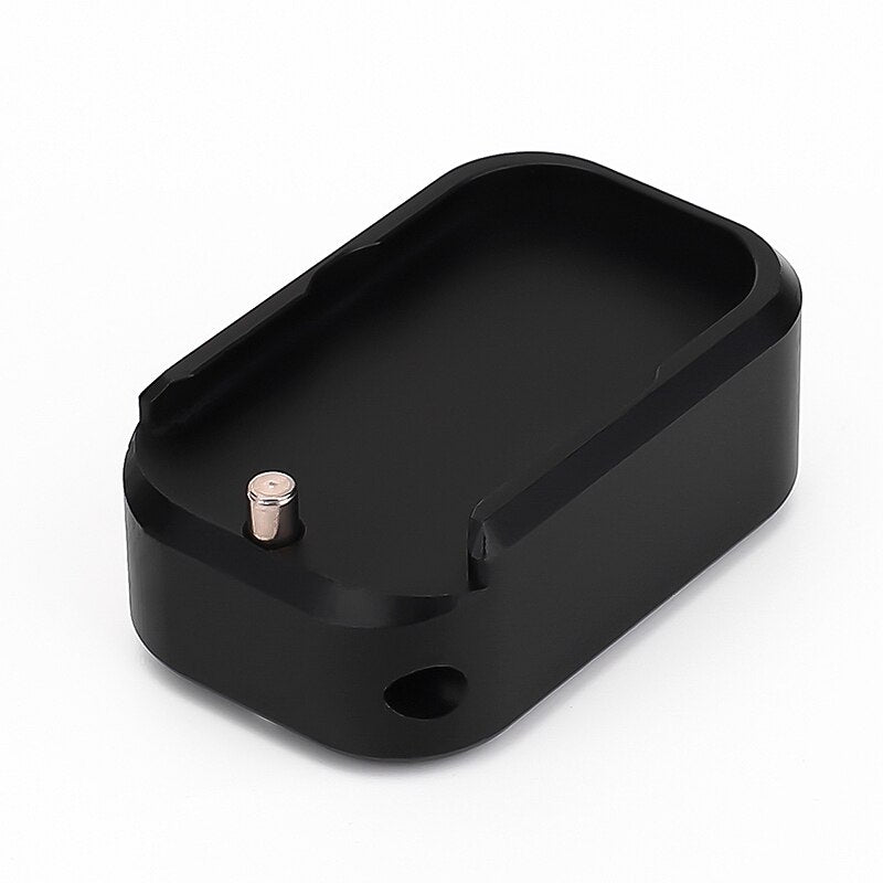 The GLOCK +0 base pad works on GLOCK models 17/ 17L /19 /26 /22 /23 /24 /27 /31 /32 /33 /34 /35. This GLOCK base pad does not add any extra rounds to the magazine, it does add extra weight to magazine which helps the empty mag drop free easier for faster reloads. Since this base pad does not add capacity to your magazine it is perfect for people that live in states with high-capacity laws. Just push the down the pin, slide the base pad onto the magazine and push the pin up to lock the base pad onto the magazine. The base pad itself is machined out of billet aluminum and is hard anodized to ensure durable long lasting color.