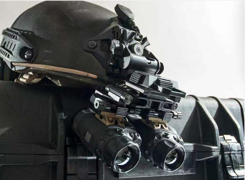 The Bino-Bridge for the BAE SkeetlRx and PVS-14 provides the operator the ability to use these devices as either a Monocular or Binocular. The SkeetlRx Bridge fits into our standard G24 NVG mount and provides a solid mounting platform and several adjustment points for a precise fit. The SkeetlRx Bridge also allows the operator to flip up the thermal/NVG flat against the helmet when not being used and can be switched between the different mounting options without the need of special tools or having to take the mount off the helmet 6061-T6,MIL-SPEC Type lll Hard Anodized Material:Anodized Aircraft Aluminum